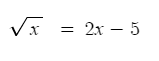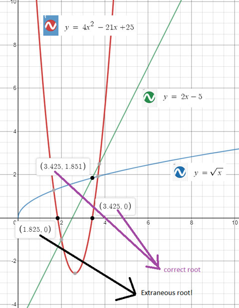 Notice with the parabola only one of its roots solves the original radical equation. The second root (x = 1.825) is introduced during the finding the parabola's roots. We call this non-solving root Extraneous to the original equation.