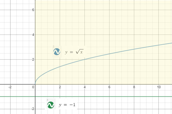 By graphing the left and right sides of the equation separately and seeing the solution as the intersection of the two sides of the equation, we can observe below that the two sides have no commonalities, and thus will never intersect. The radical (left side of the equation) exists only in the first quadrant (highlighted area), while the right side of the equation, the line y = -1, passes below the graph without ever touching the first quadrant. Therefore there are no solutions to this equation, as shown below.